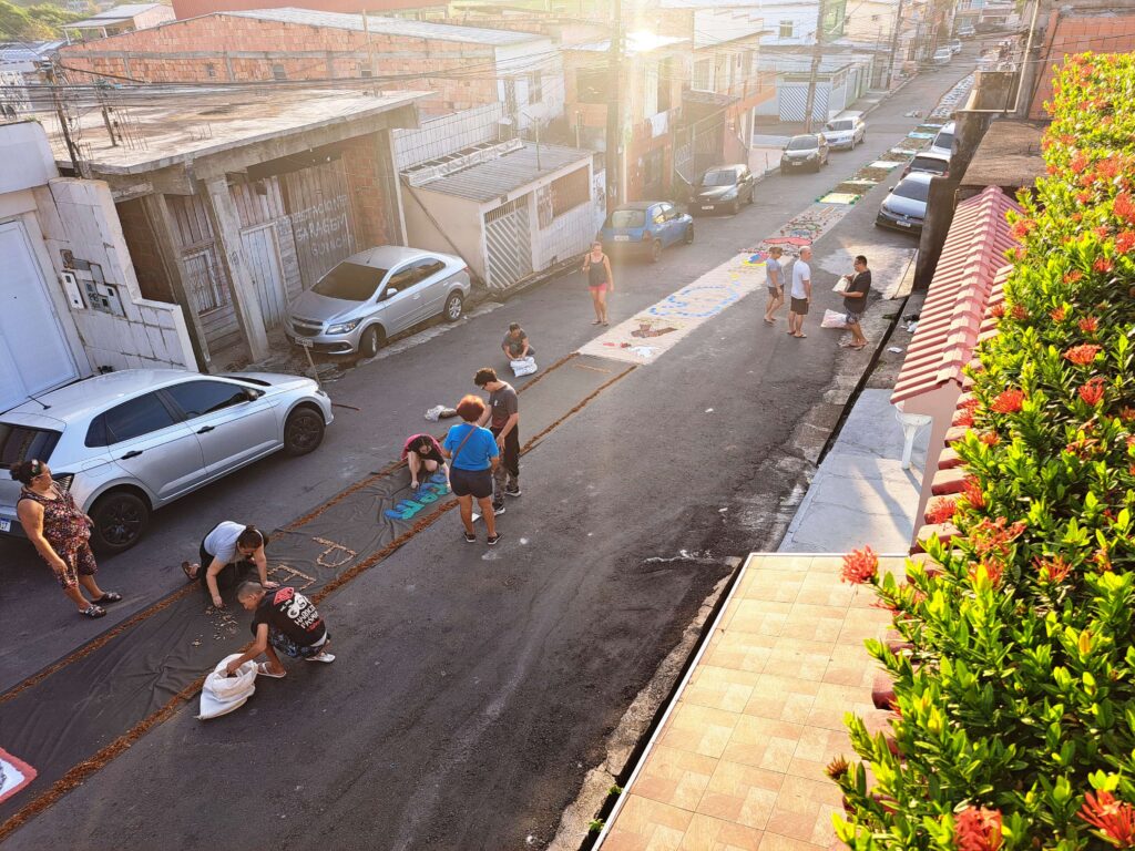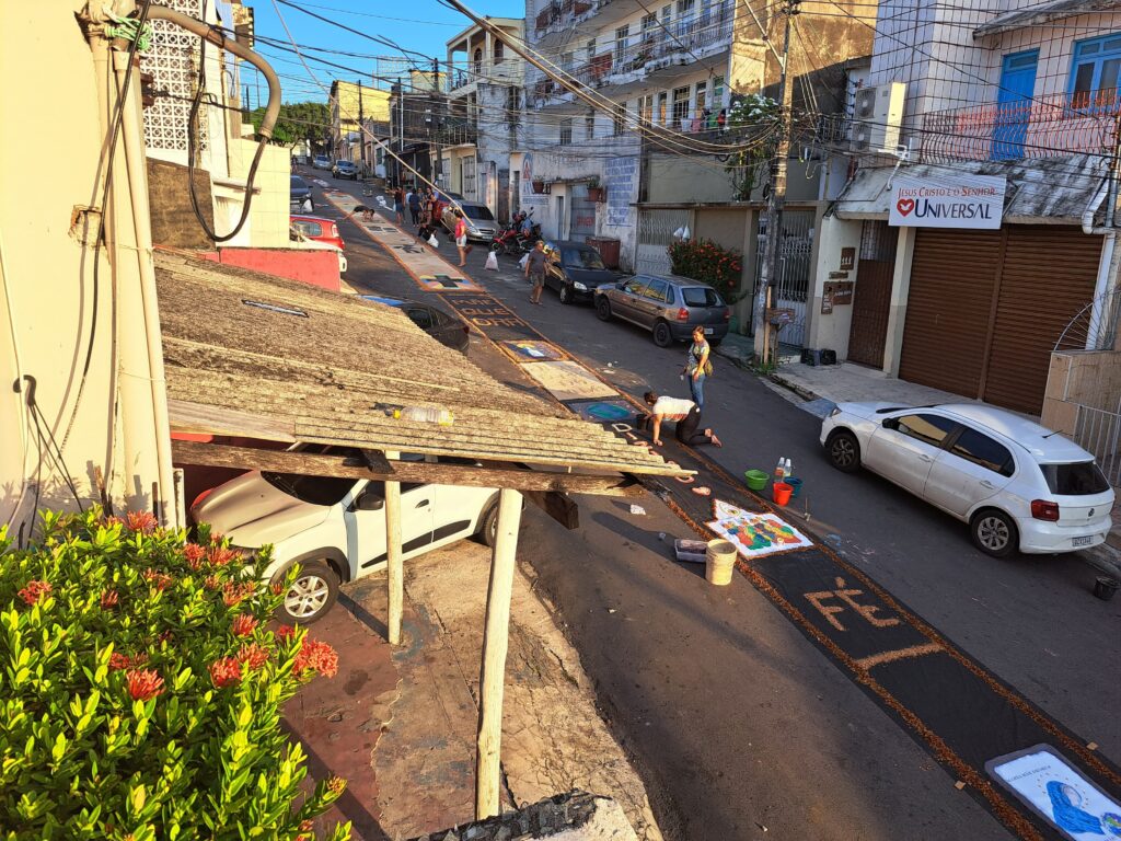 Fiéis enfeitam rua com tapetes de Corpus Christi pela primeira vez no bairro da Glória em Manaus