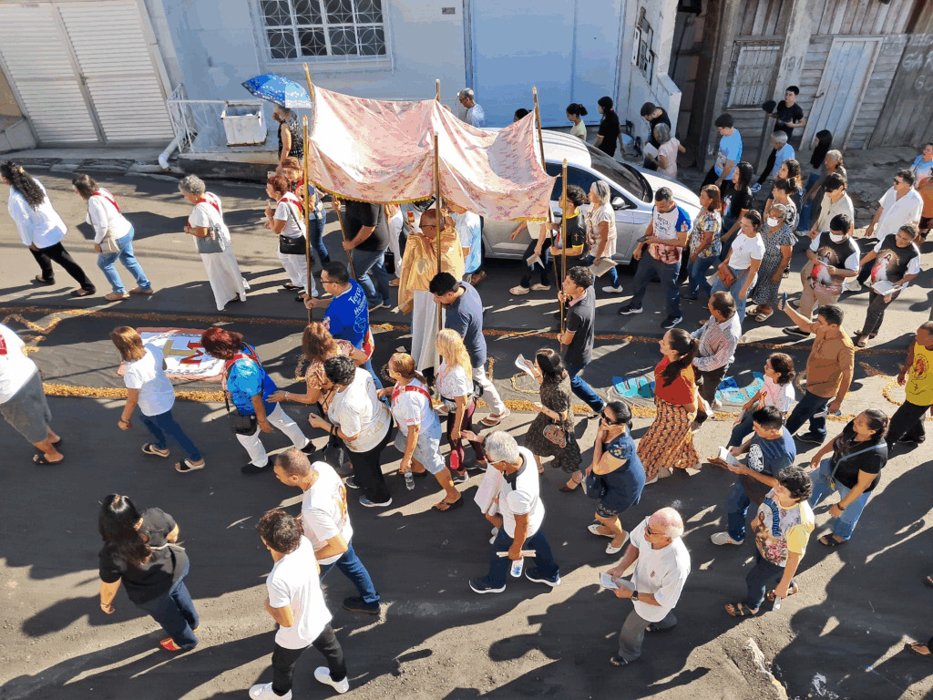 Moradores do bairro da Glória, na zona Oeste de Manaus, reuniram-se nesta quinta-feira (19) para cumprir uma tradição de enfeitar as ruas com tapetes coloridos para a procissão de Corpus Christi. A prática comum é realizada em diversas cidades brasileiras, mas, segundo os próprios fieis, foi concretizada pela primeira vez na Rua da Glória, durante toda a história da paróquia Nossa Senhora da Glória, que começou em agosto de 1959.